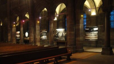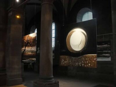 La scénographie de l’exposition prend possession de tous l’espace : 10 grands tableaux suspendus entre les piliers majestueux de l’église, une installation évoquant la rivière, un grand format devant la chaire… A découvrir !